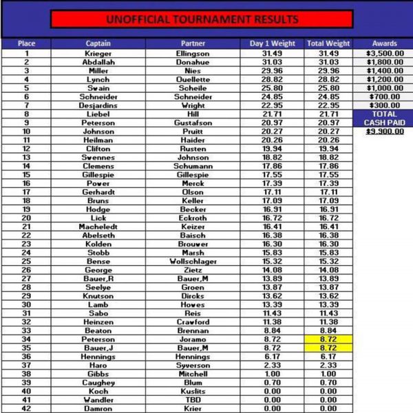 Justin Krieger and Rick Ellingson take the win with 31.49 pounds at the North Dakota AIM Weekend Walleye Series event this past Sunday on Lake Sakakawea.
