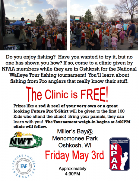 Bring your kiddos out on Friday to the Bass Pro Shops /Cabelas National Walleye Tour event held in Oshkosh Wisconsin at Menominee Park. (@approx 430pm) for the National Professional Anglers Association Kids Fishing Clinic at Miller’s Bay, Menomonee Park – Kids get a rod/reel or t-shirt!