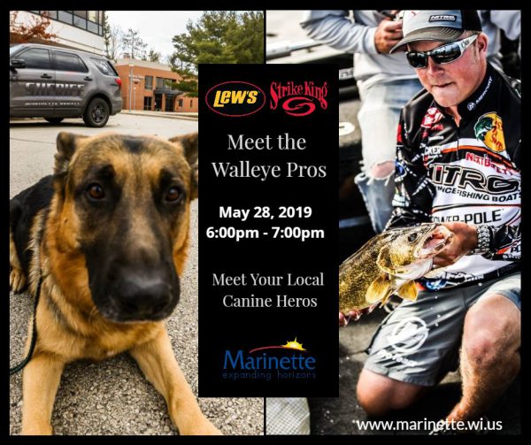 Meet your local Police Canines at the Strike King/Lews Meet the Pros Night. Come on by the Marinette Community REC Center May 28, 2019 from 6:00-7:00pm. First 100 will receive a FREE hat.